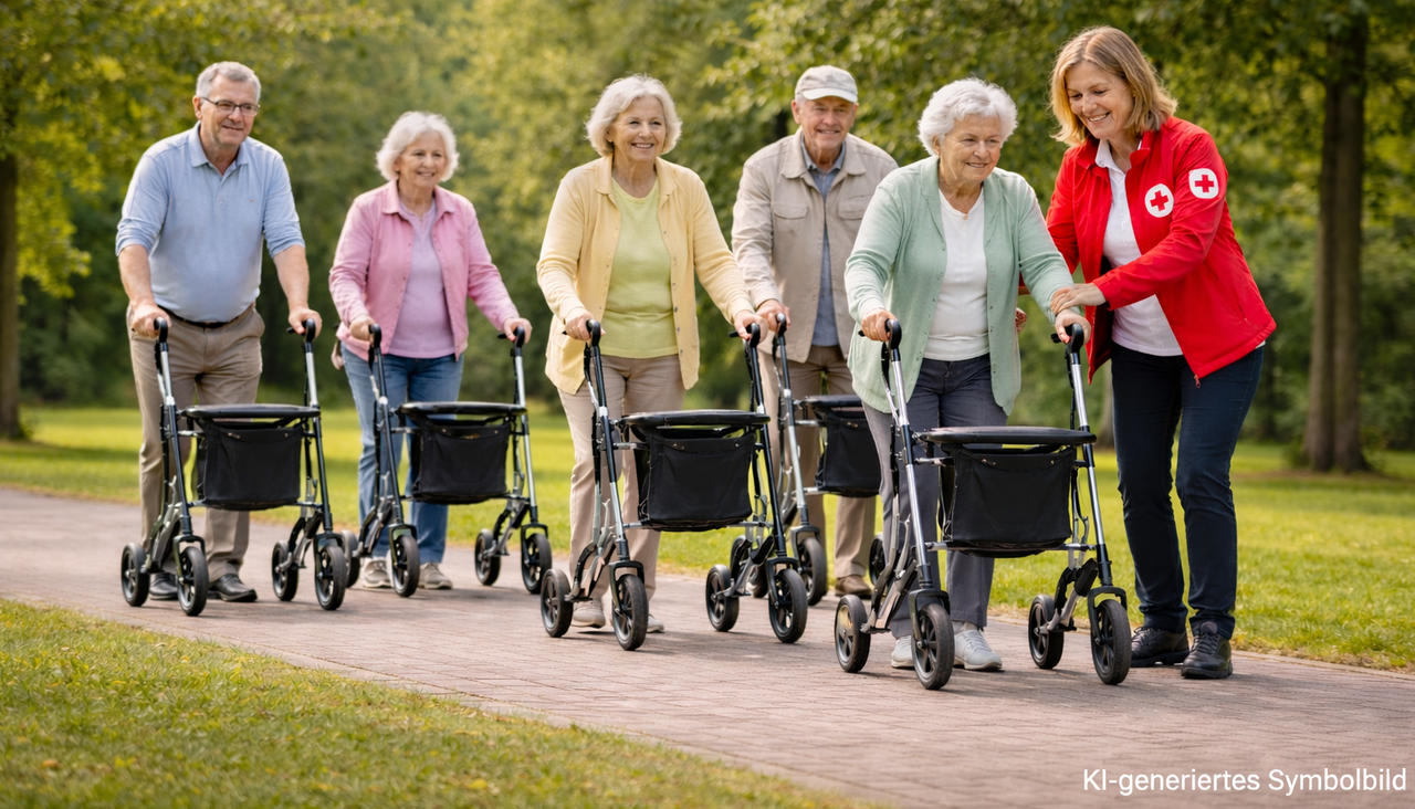 Das Rollatortraining des Deutschen Roten Kreuzes unterstützt Seniorinnen und Senioren dabei, sich sicher, selbstständig und mit mehr Vertrauen im Alltag zu bewegen. In kleinen Gruppen vermitteln wir praxisnah und alltagsorientiert den richtigen Umgang mit dem Rollator.